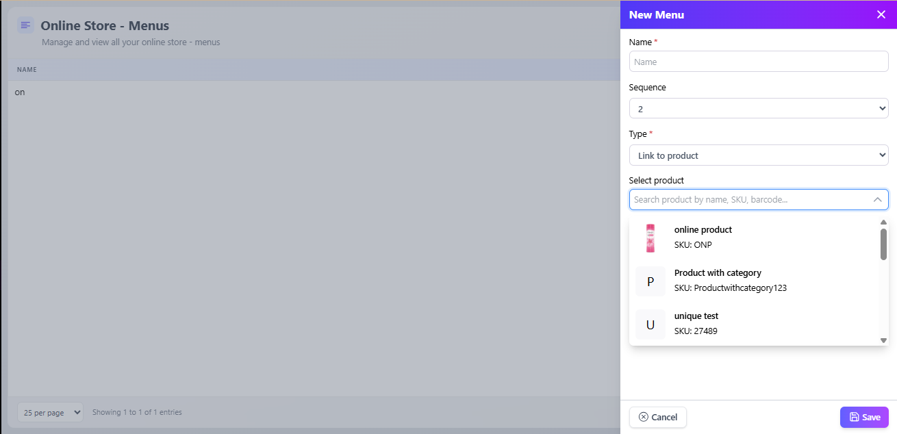 Add menu item → select type (Category, Product).