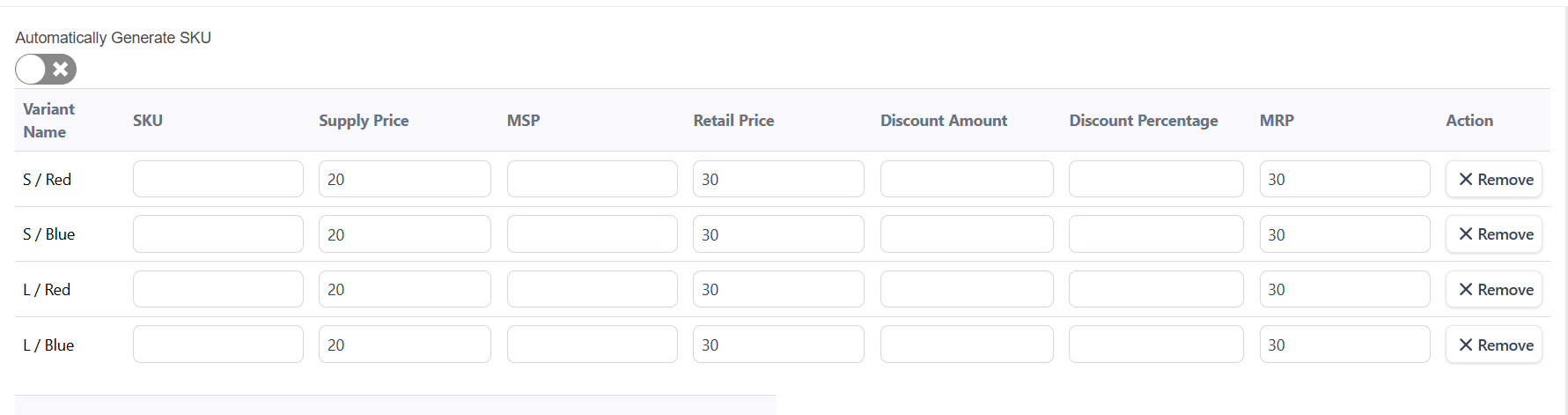 For each variant, enter: SKU, Price, MRP etc.( Automatically Generate SKU toggle for automatically added the sku based on the parent sku)