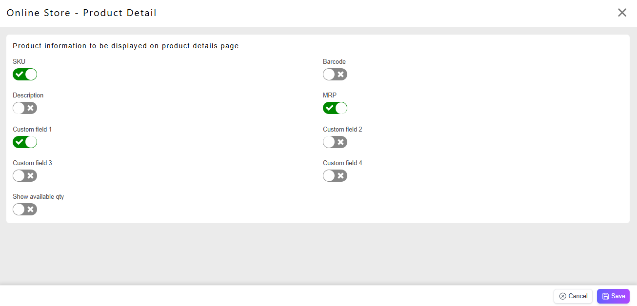 Show MRP, Description, Specifications, SKU, Variants, Custom field 1, toggle.