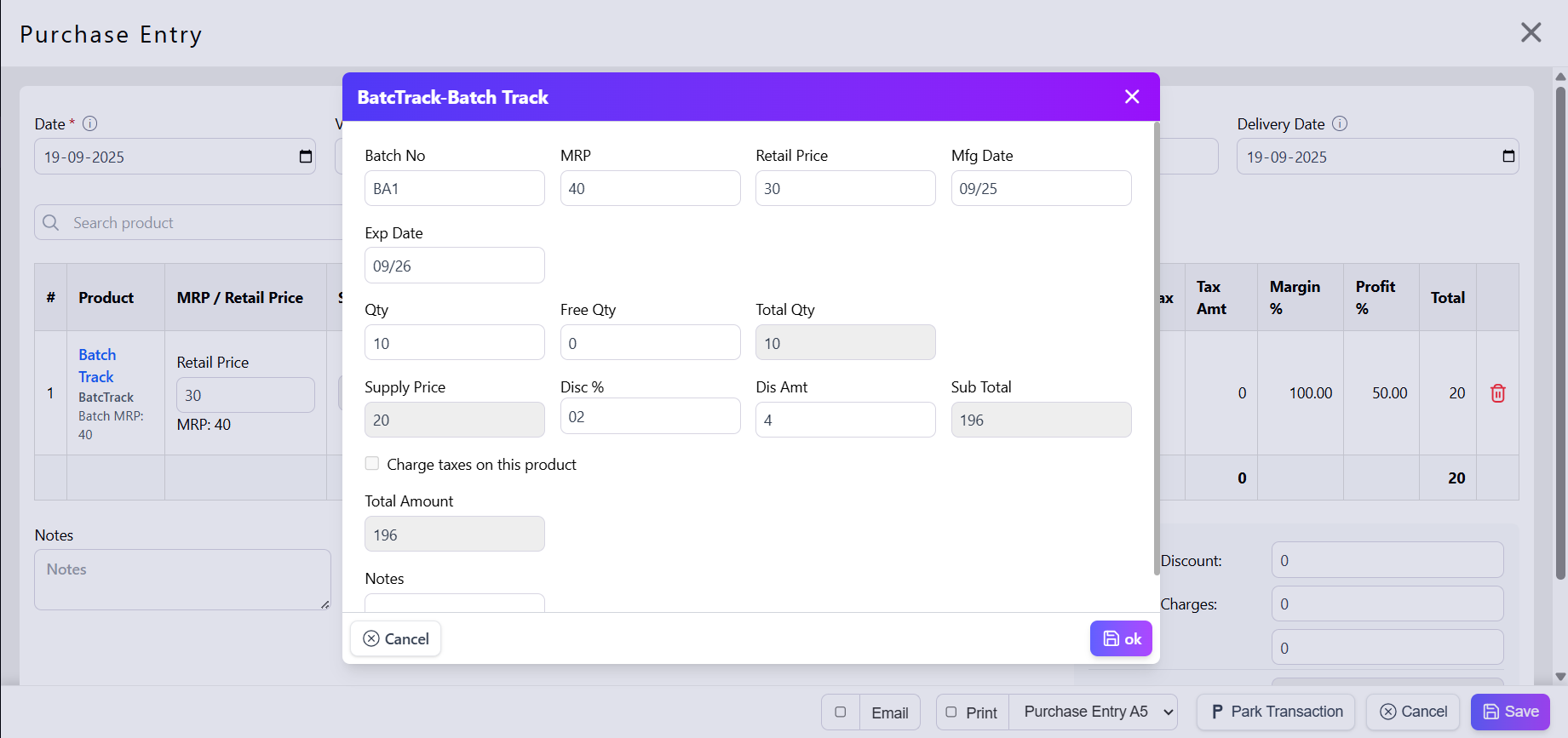 Sales will reduce stock of specific batches, and expiry checks can warn you for near-expiry stock.
