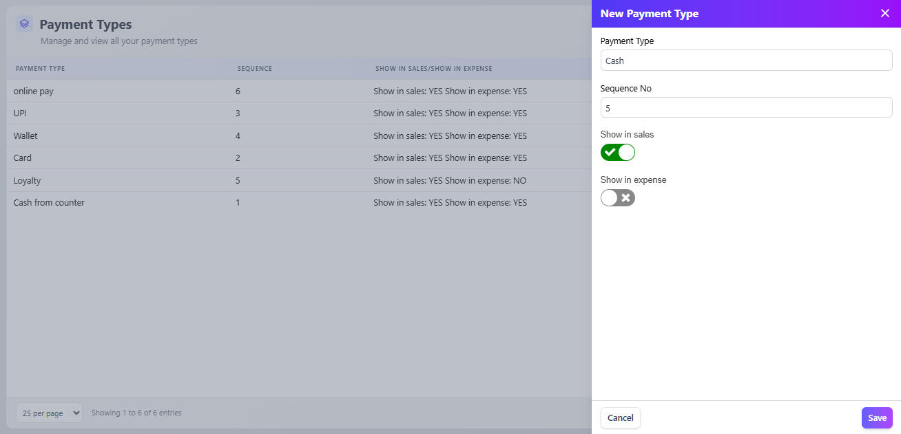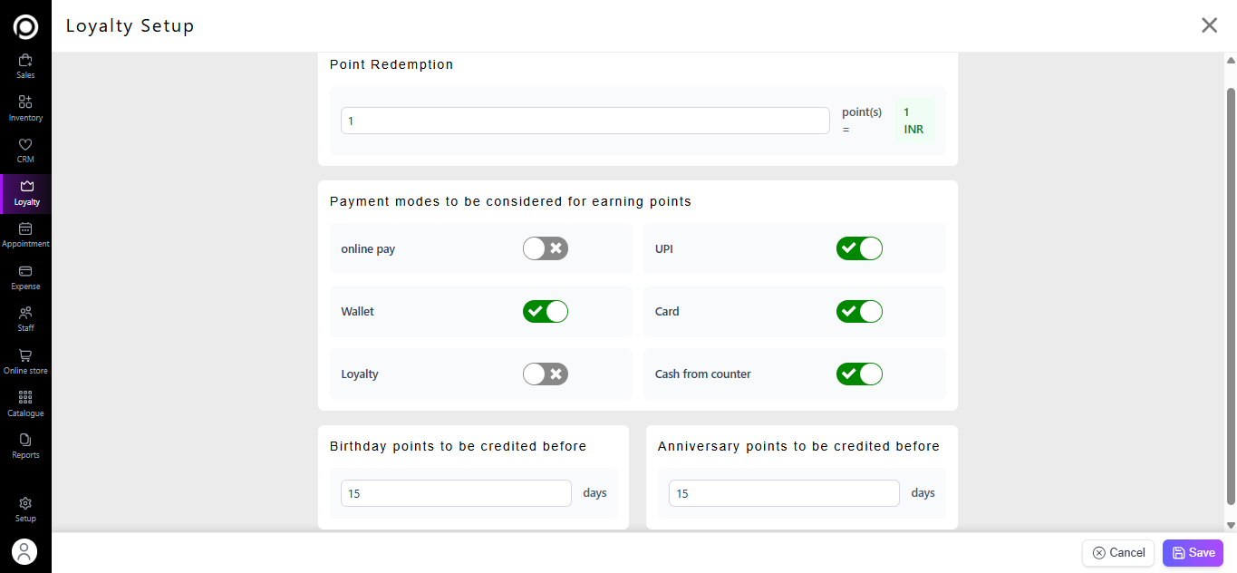 Cash on delivery, Wallet, Loyalty, — toggle on if you accept.