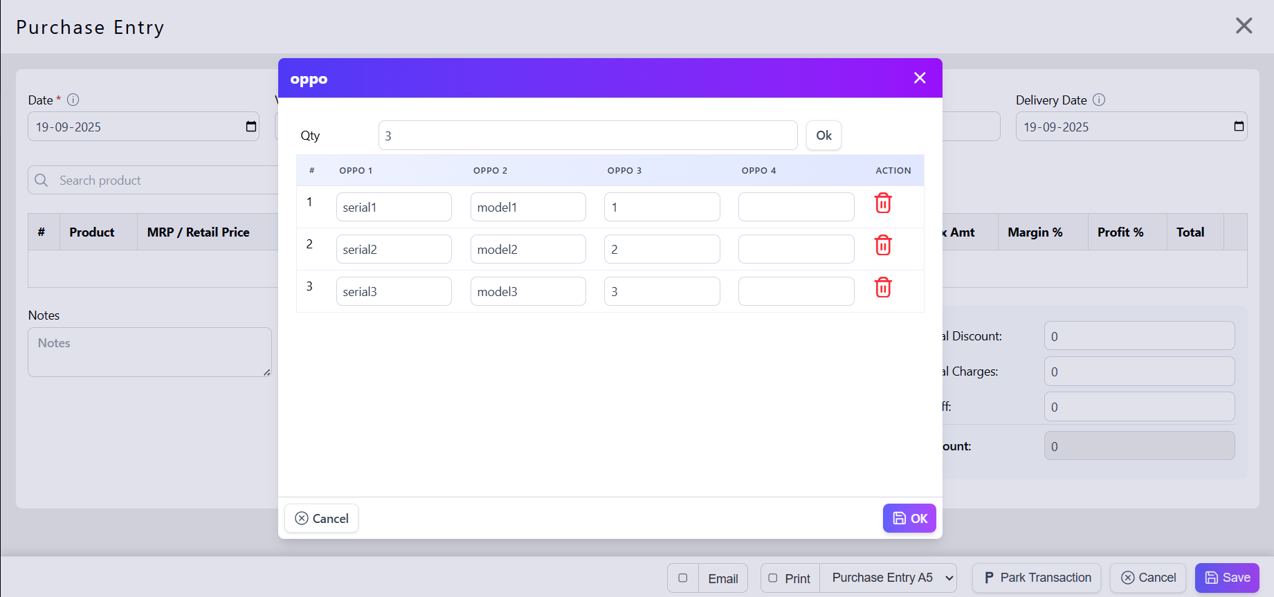 On sale, select which serial number you are selling — system tracks warranty/repairs by serial.