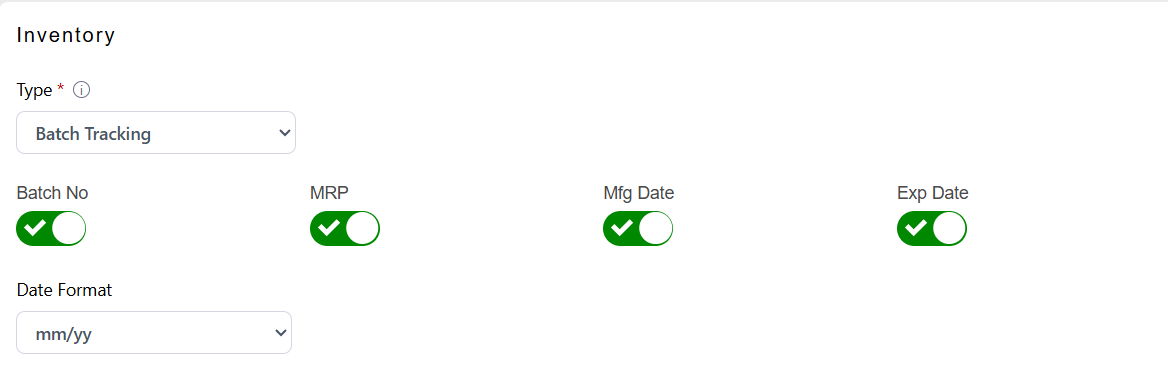 D. Inventory Type = Batch Tracking