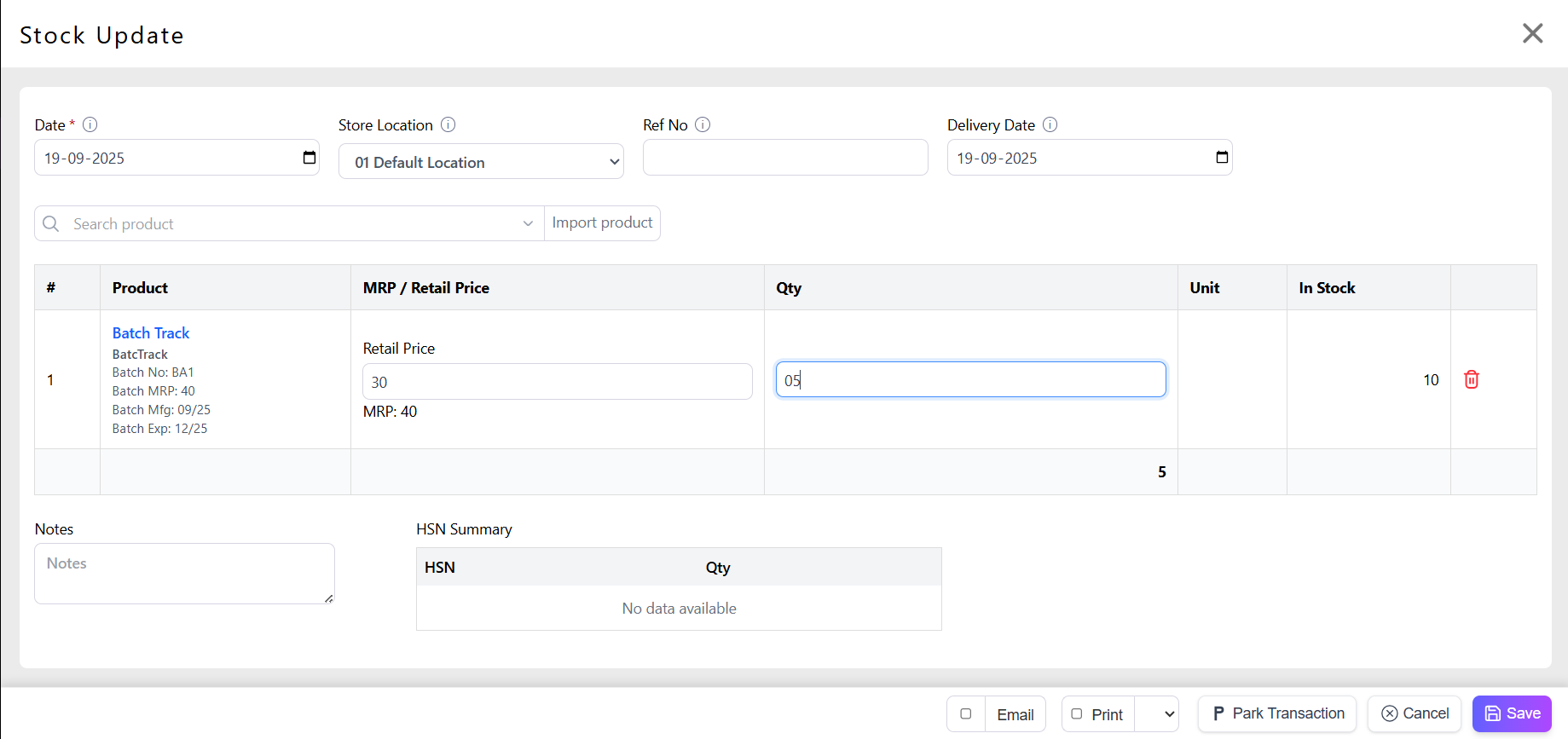 Example: Batch B2025, Mfg 01-01-2025, Expiry 01-01-2027, Qty 100.