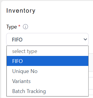 After you pick Goods For Sale, go to the Inventory section and set Inventory Type. Follow the specific steps for each inventory option below.