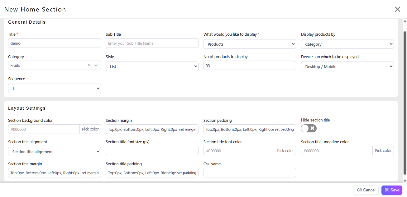 Save and reorder sections to define homepage flow (banner → categories → featured products → testimonials).