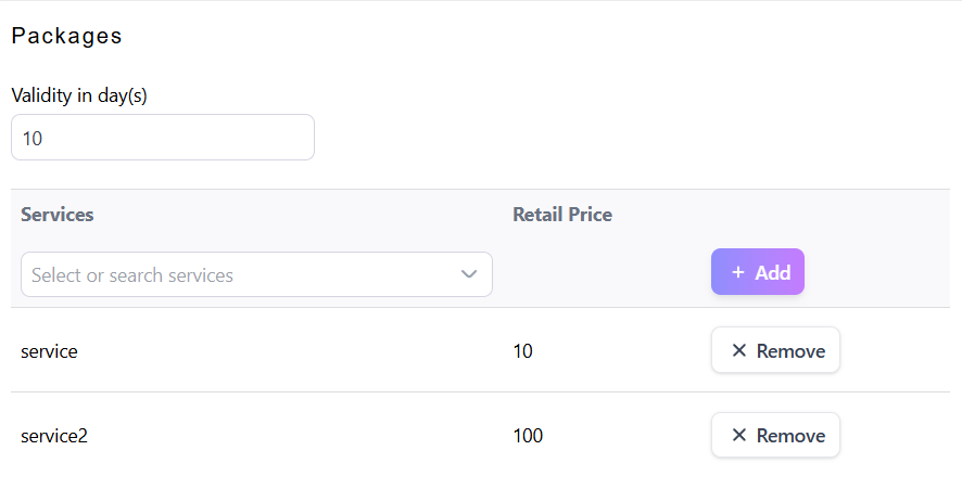 - Package → Bundle of Services (you can assign the duration and the number of times a service can be provided in that particular package).