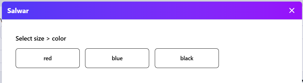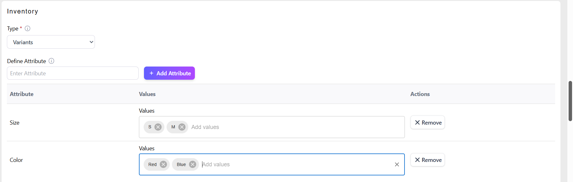 Under each attribute, add values (Size → S, M, L; Color → Red, Blue).