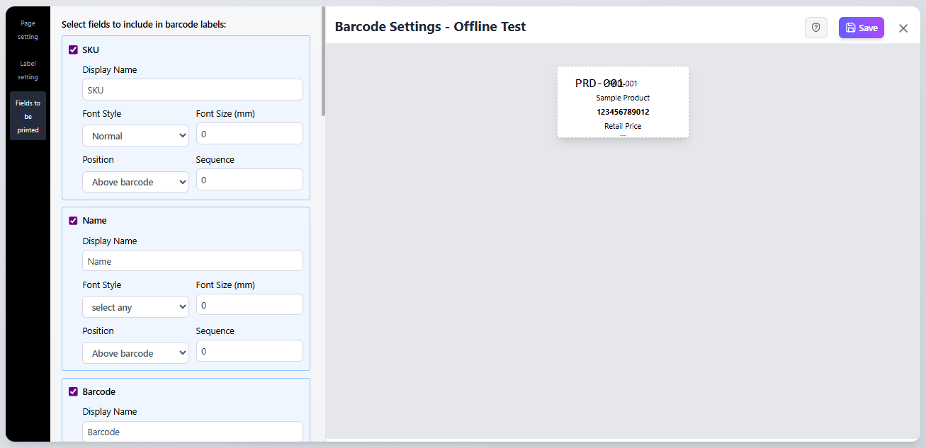 Show MRP, Description, Specifications, SKU, Variants, Custom field 1, toggle.
