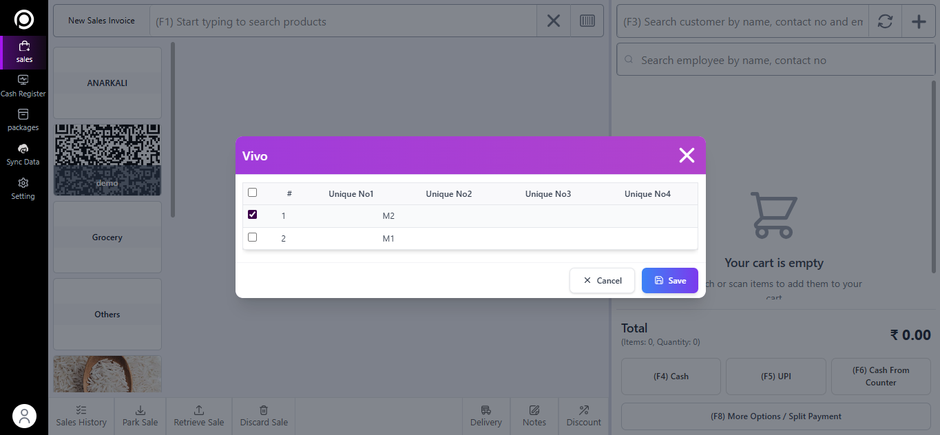 On sale, select which serial number you are selling — system tracks warranty/repairs by serial.