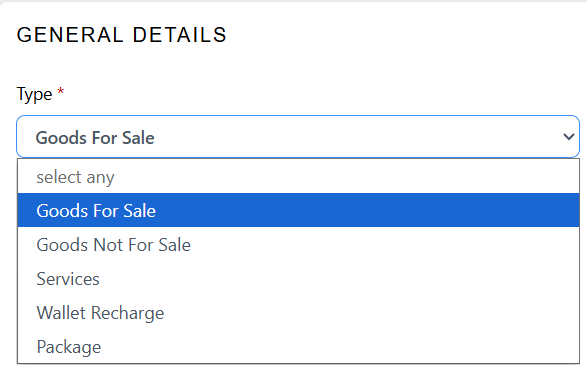 Select Type from the dropdown (choose one of: Goods For Sale, Goods Not For Sale, Services, Wallet Recharge, Package).