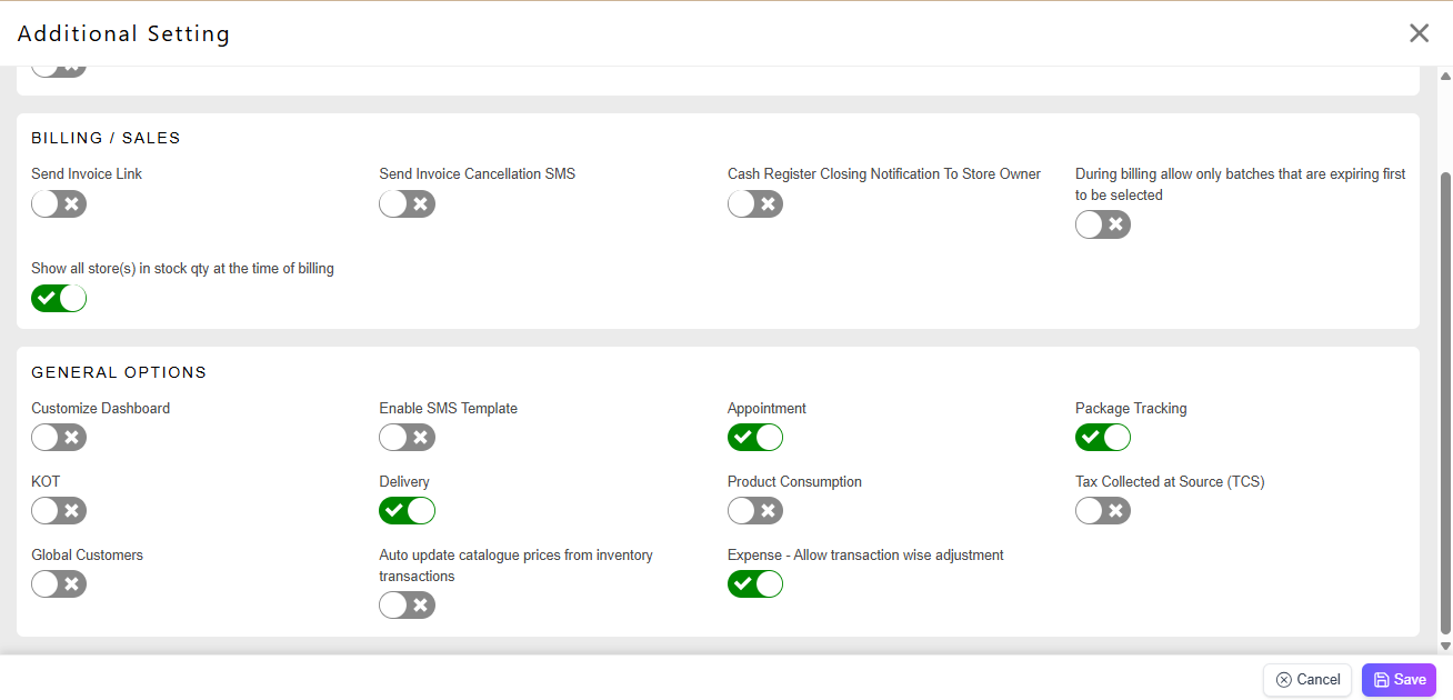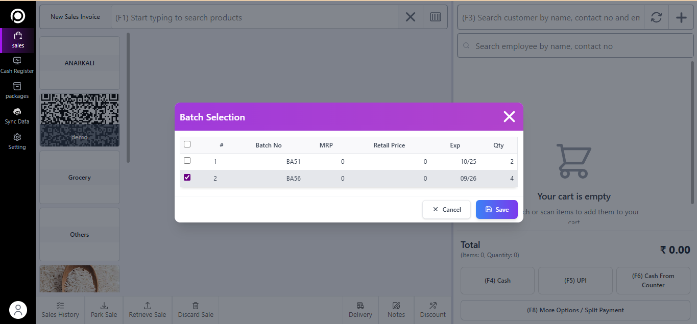 Sales will reduce stock of specific batches, and expiry checks can warn you for near-expiry stock.