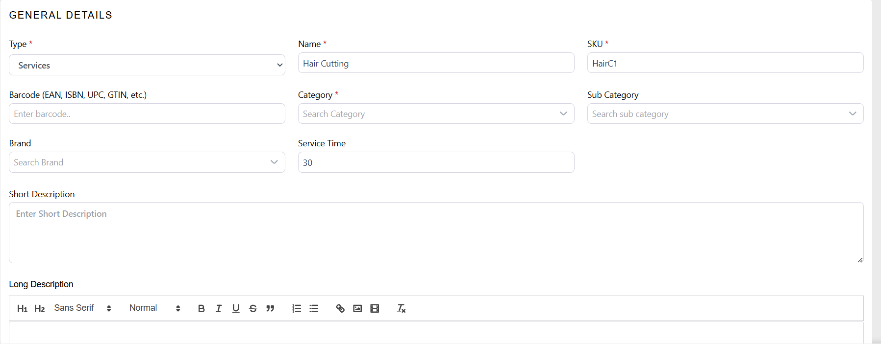 Steps: Choose Type = Services, provide Service Name, Service Time in Minutes, Price and other details then Save.